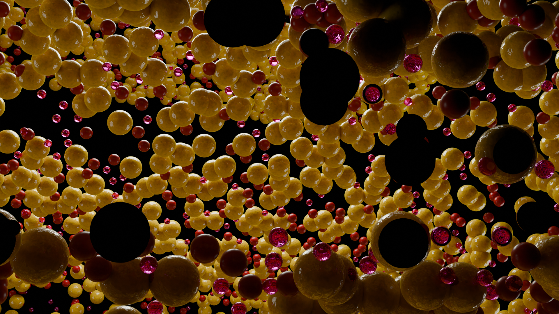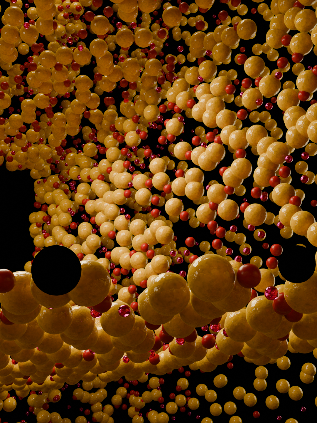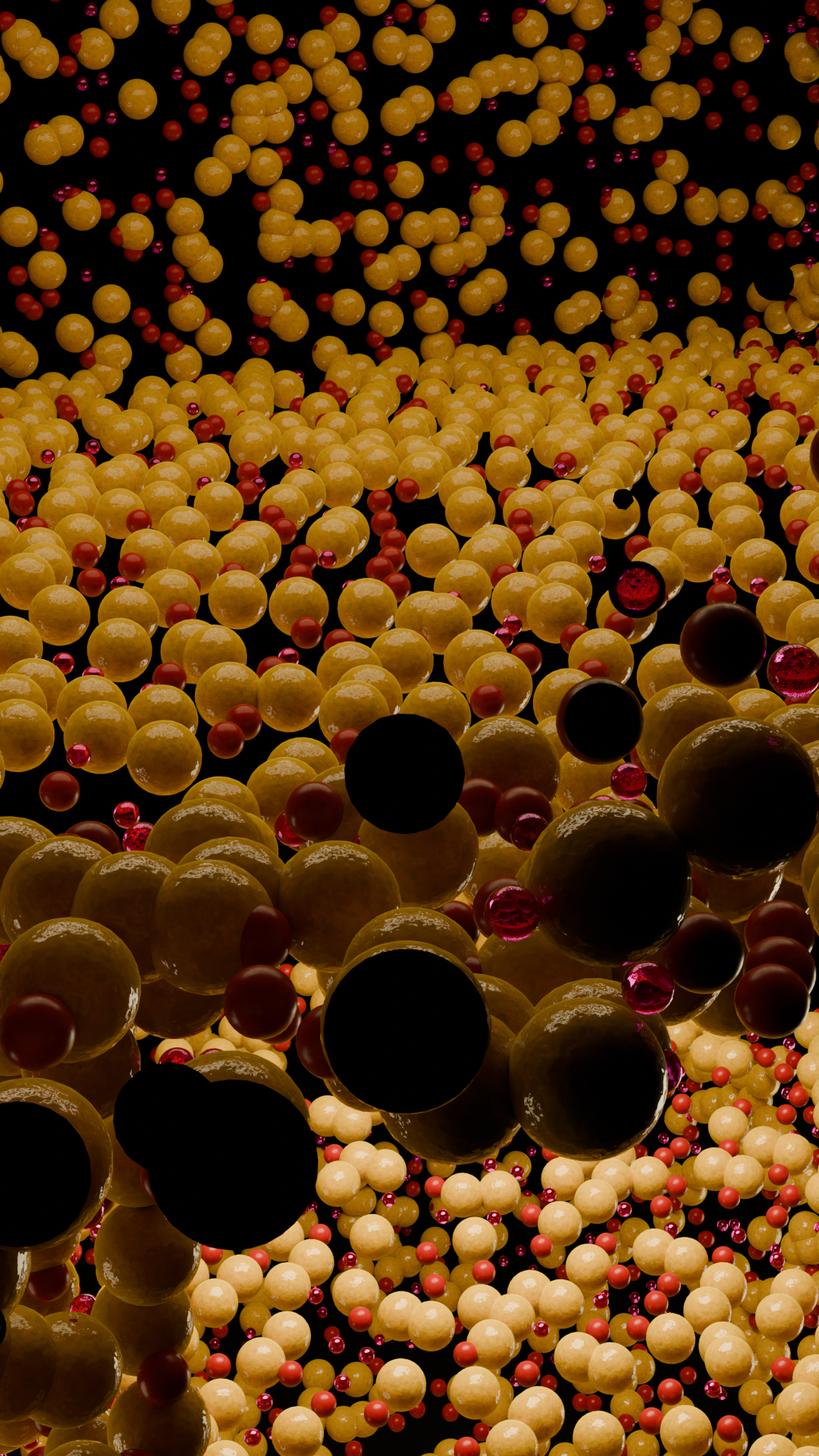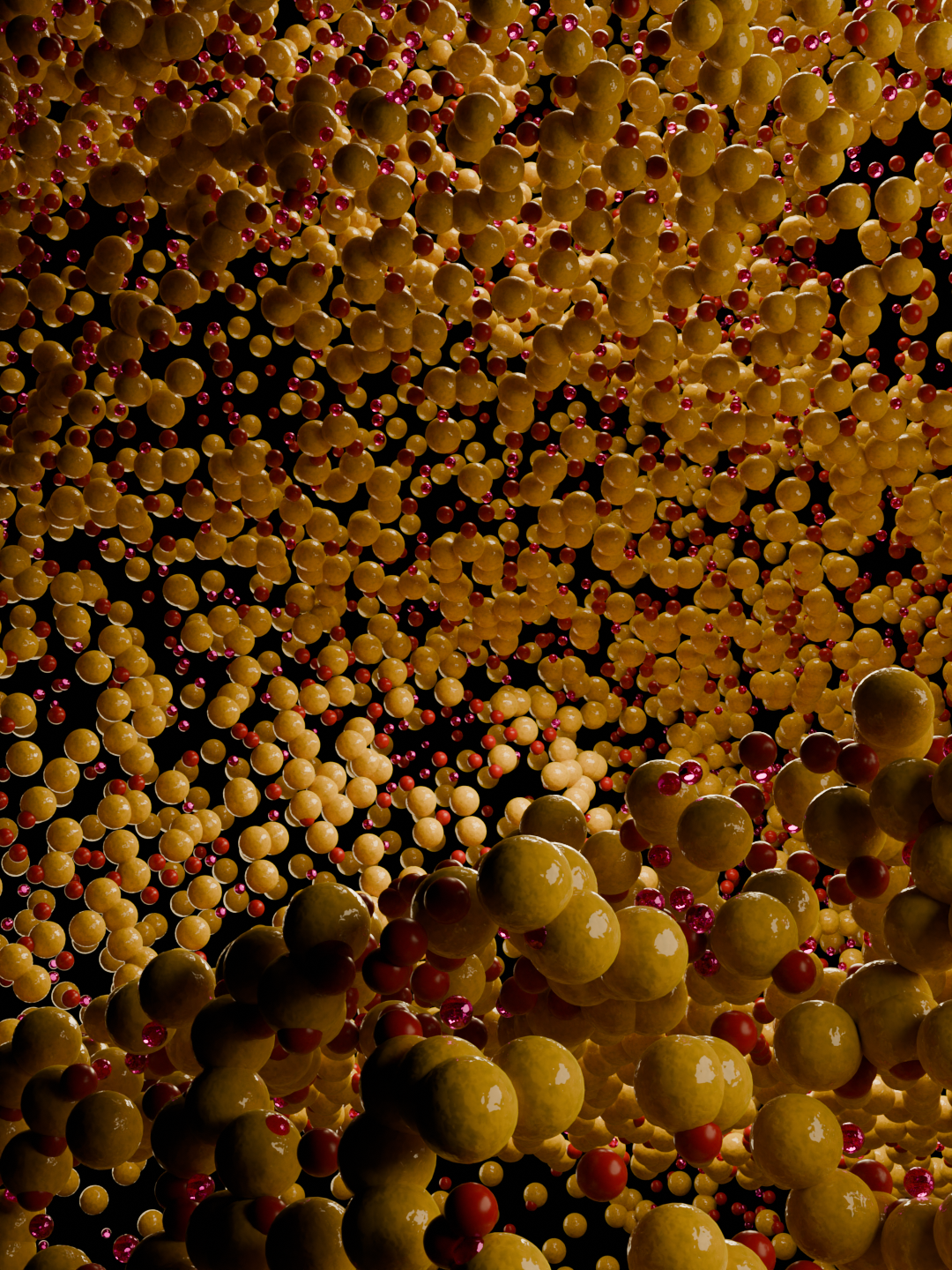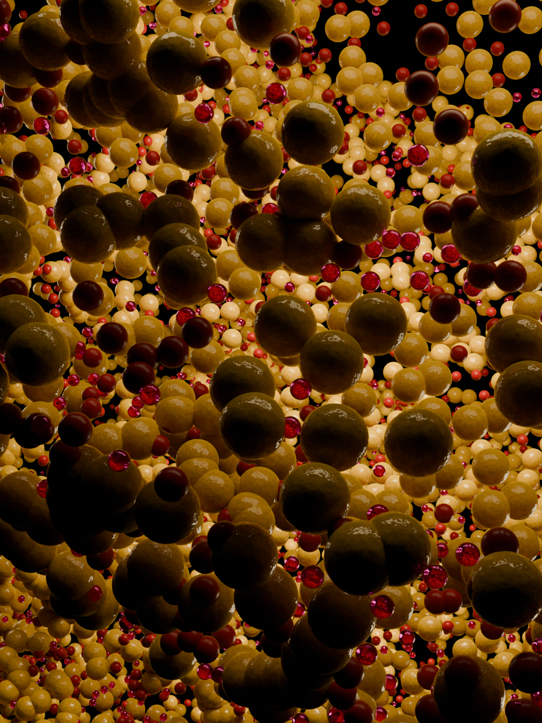 Concept visualizes the mind at the precise moment when thinking becomes strained by overload. The dense accumulation of golden spheres suggests stored knowledge and accumulated experience, compressed into a limited cognitive space, while the smaller red particles behave like intrusive stimuli emotions, alerts, micro-decisions moving rapidly and unpredictably through the system.